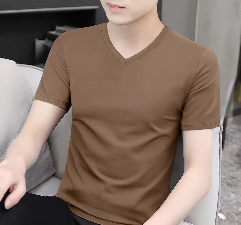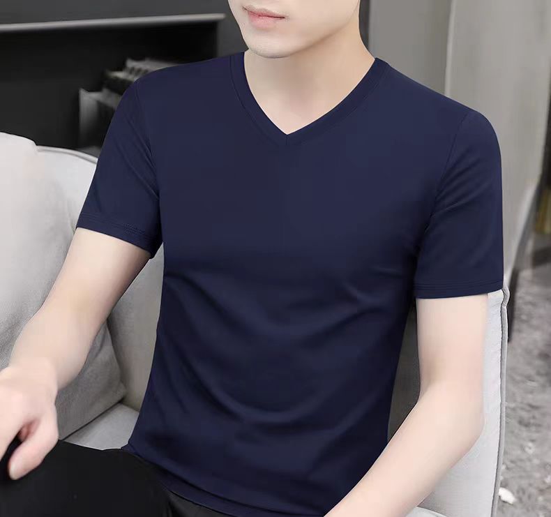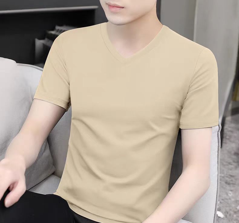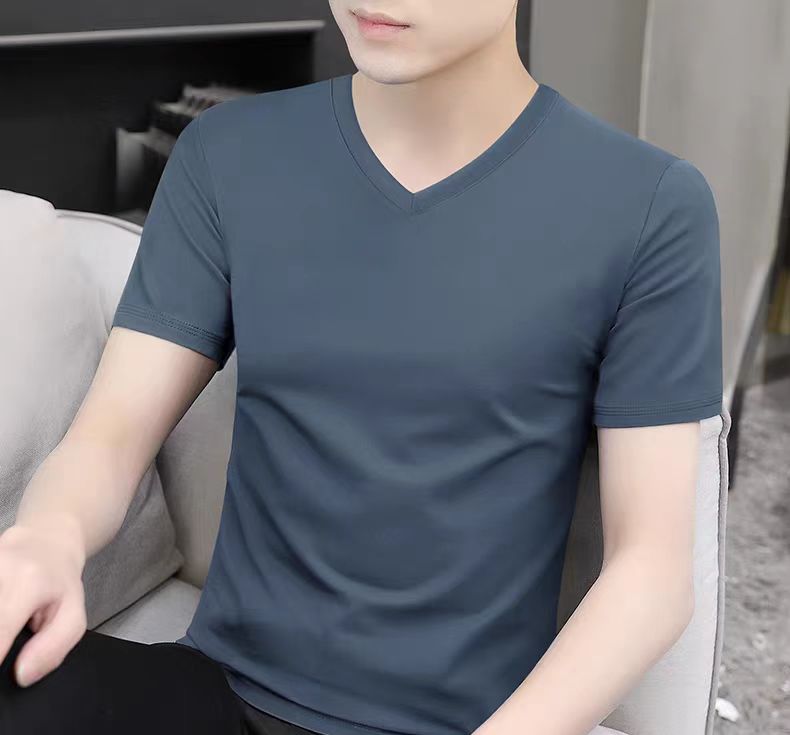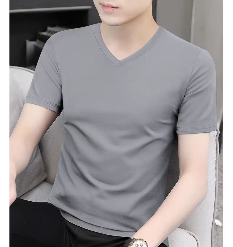 Summer new style men's V-neck solid color short-sleeved T-shirt, premium top.